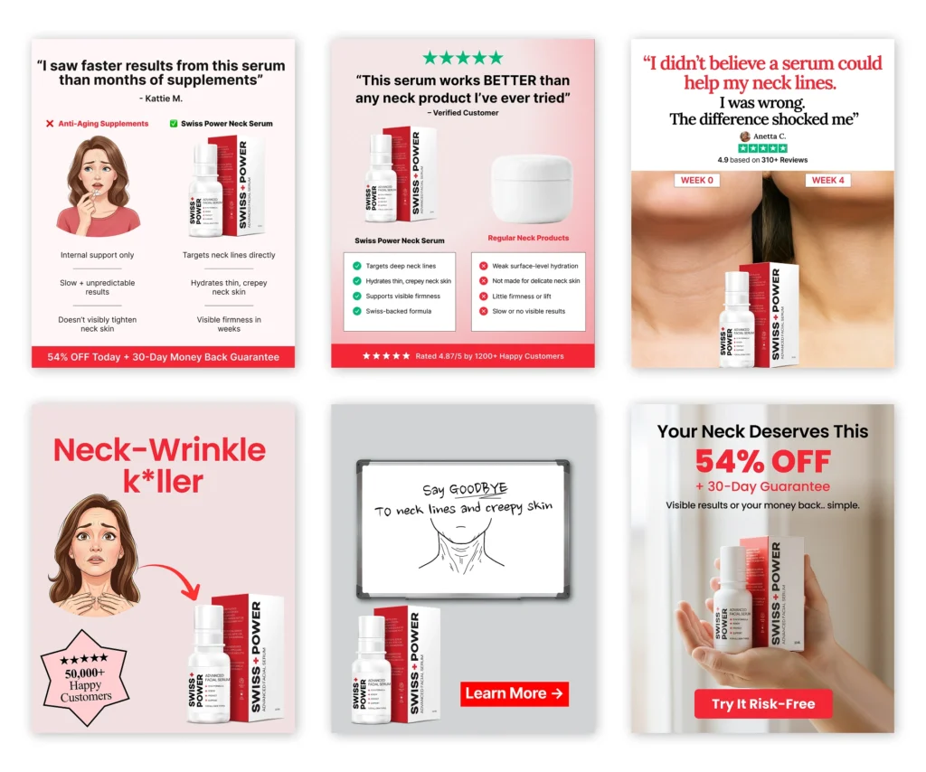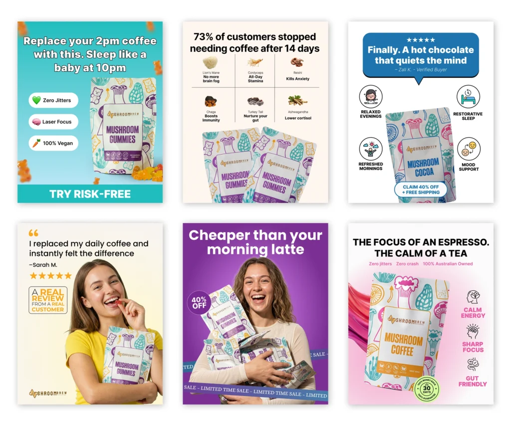 We research and design high-converting static ads. From simple product shots to benefit-driven graphics, we create variations that lower your CPA.